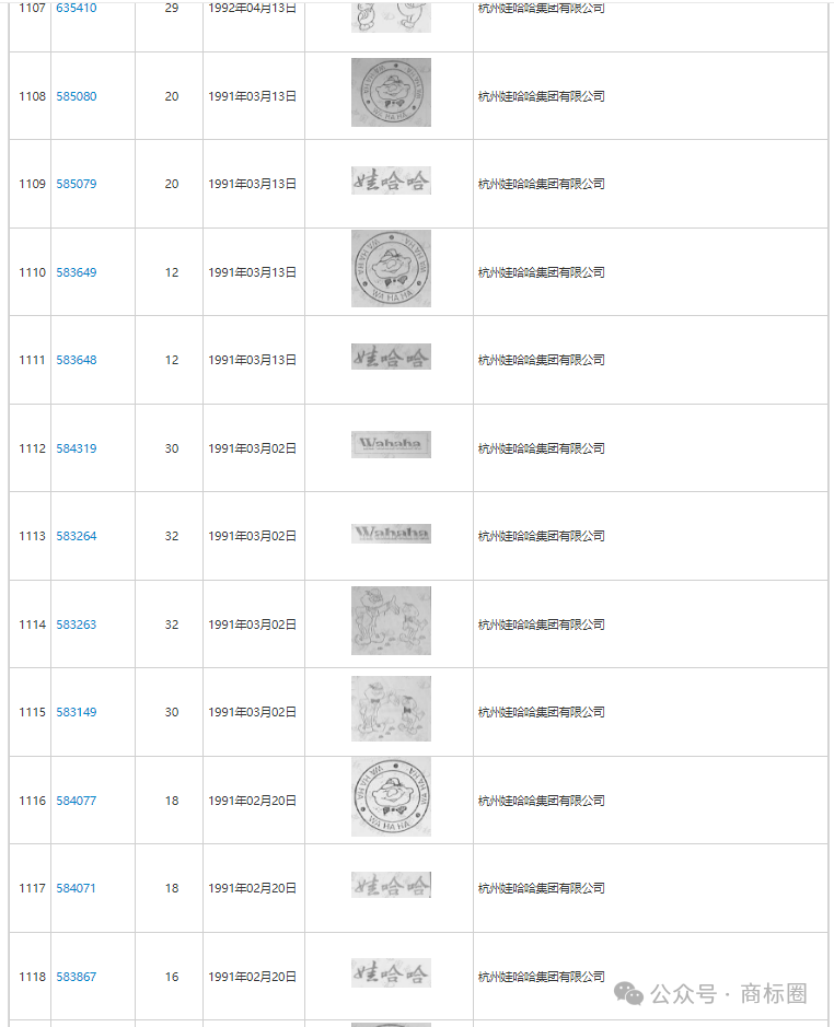 ●起始阶段(1988年):娃哈哈的起点是精准的类别注册。其经典图文商标最初注册在第5类,直接对标核心产品“娃哈哈营养液”。品牌名称“娃哈哈”本身具有易读易记、积极乐观的特性,且借助同名儿歌的广泛传播,迅速提升了品牌知名度。这一阶段体现了企业初期对核心商标在核心类别上的基础性保护。