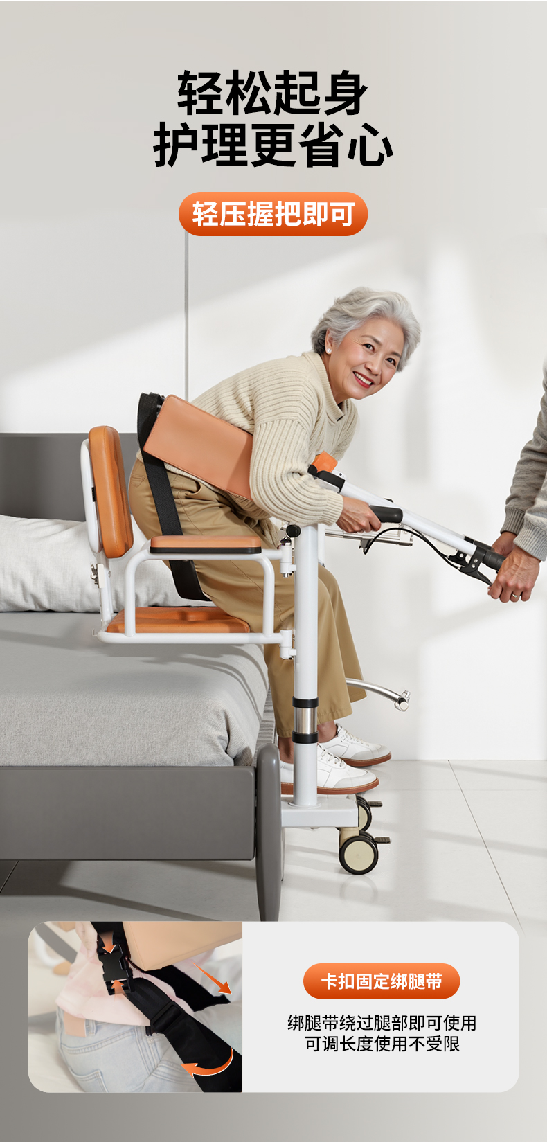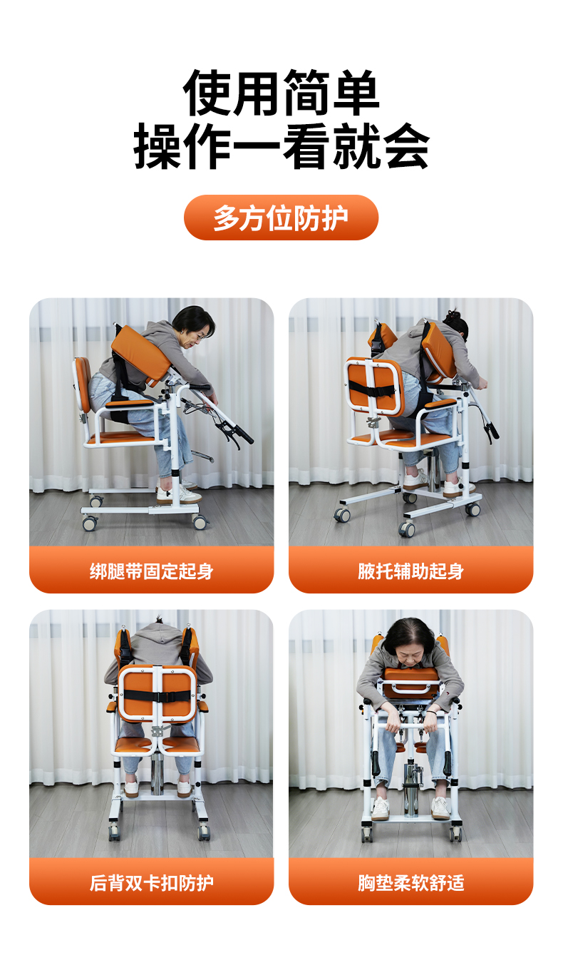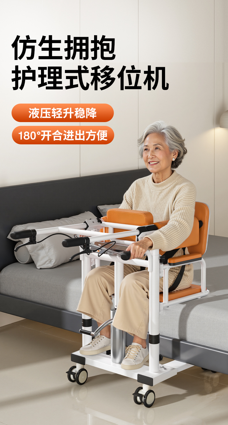 在安全性与舒适性设计上,该移位机采用360°海绵仿生拥抱结构设计,减少胸腔的压迫,能均匀分散老人身体压力,转移过程更舒适。操作简单照护者单人即可完成全部移位流程,大幅降低照护者腰部损伤。同时,液压升降平稳,移位过程中避免大幅度身体姿势改变,有效缓解老人因移动产生的身体不适与心理恐慌。