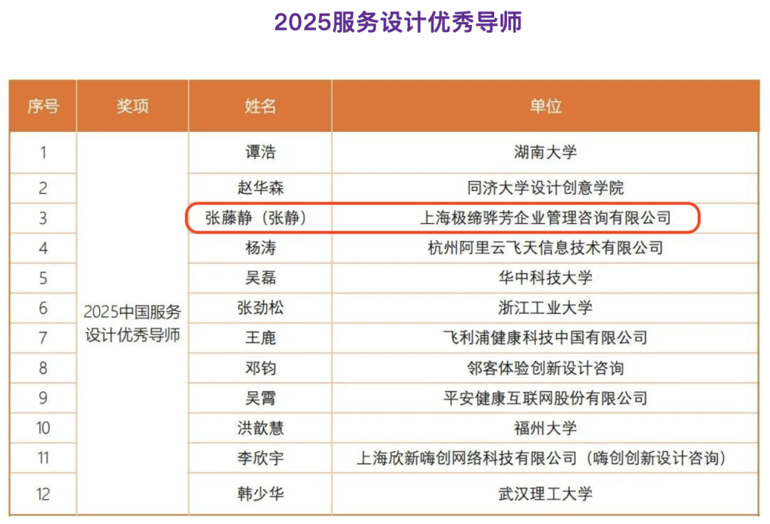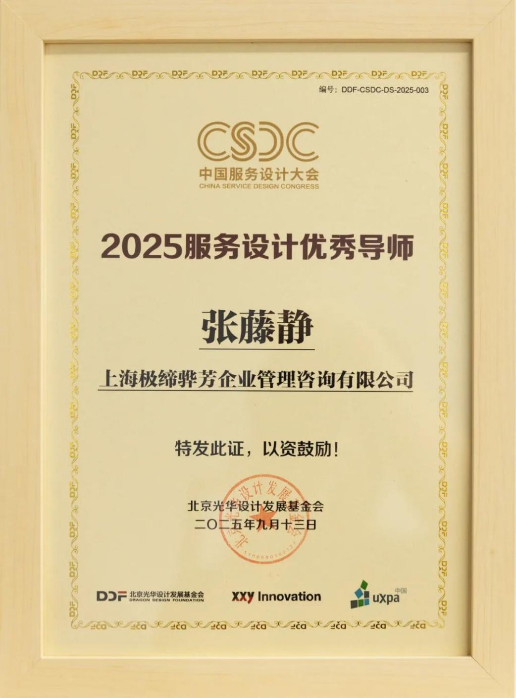 极缔咨询创始人、ISE国际服务效能首席技术官/总督导张藤静女士,因在服务设计方法论研究、实践推广及人才培养方面的突出贡献而入选2025中国服务设计优秀导师。