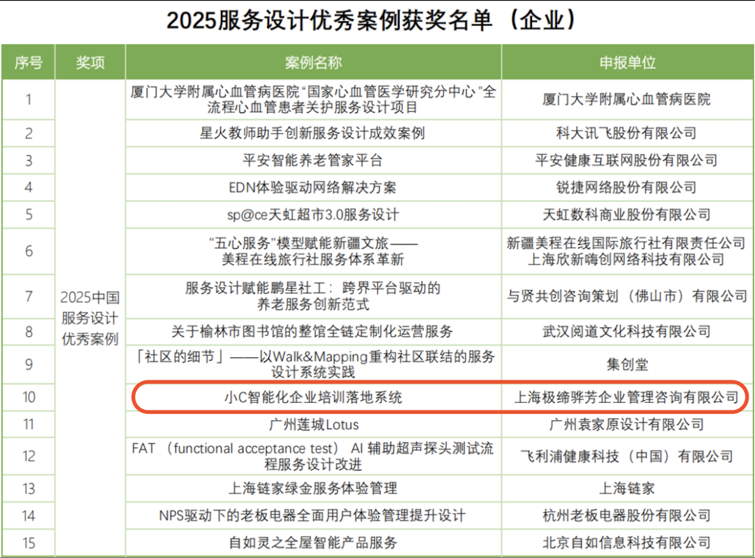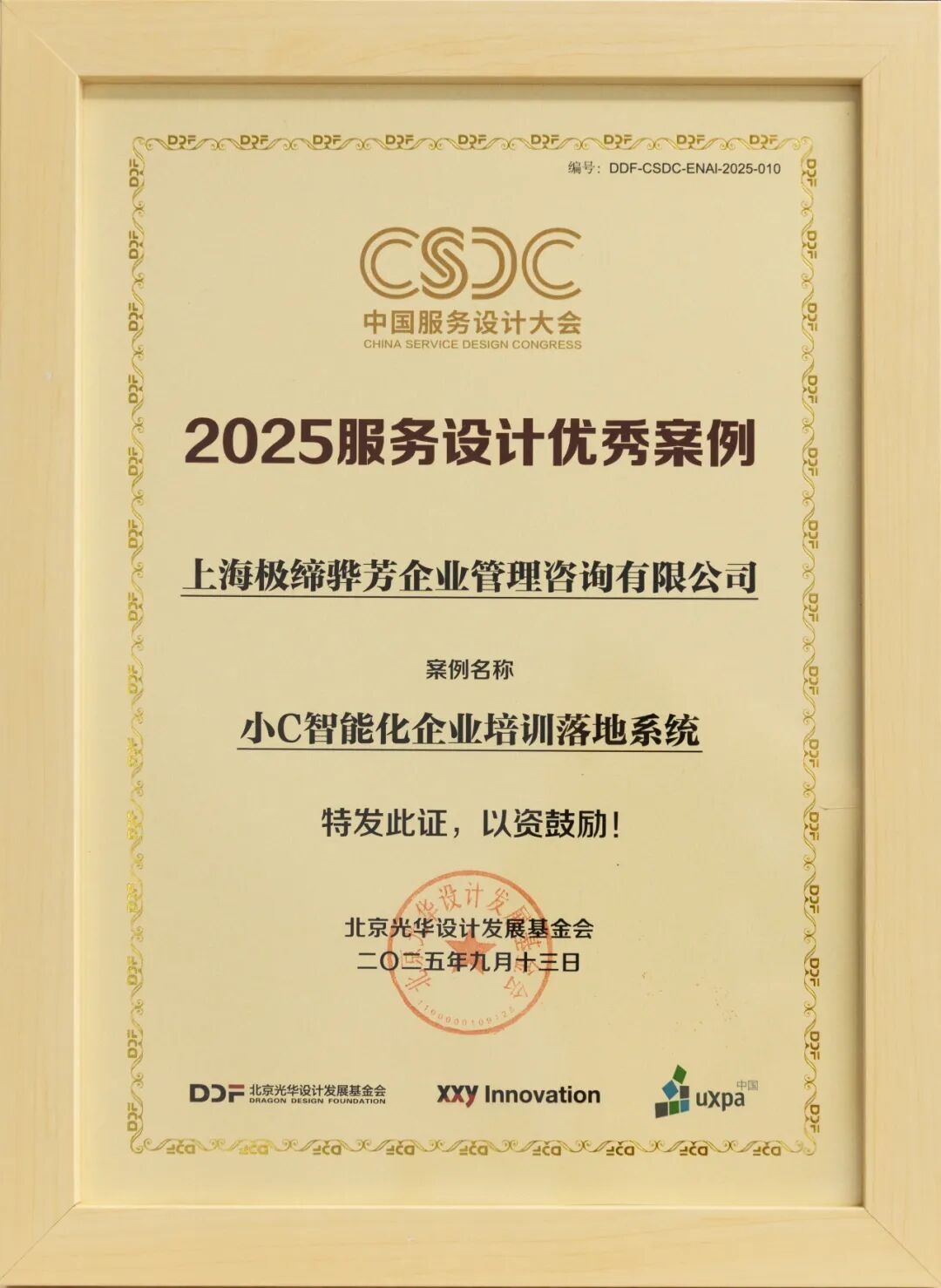 极缔咨询自主研发的“小C智能化企业培训落地系统”(涵盖小C魔方及小C智能训练),以用户体验为中心,深度融合人工智能技术,为企业培训场景提供高效解决方案,获得评审委员会高度认可,获得2025中国服务设计优秀案例奖。