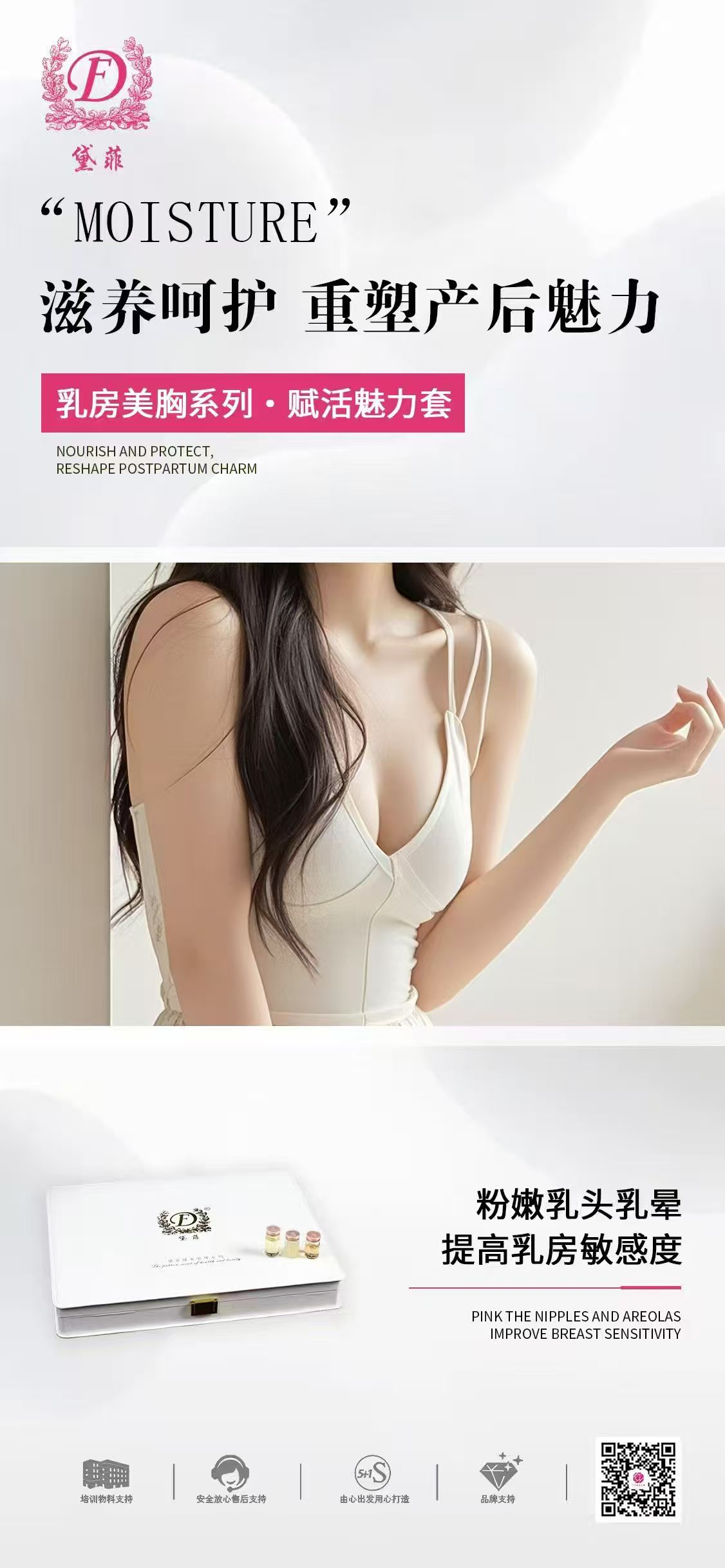 本套盒的护理效果最大化依赖于专业人员的精准手法与操作流程,因此将作为专业护理产品,率先进驻全国多家高端月子中心。它特别适合关注产后乳房形态改变(如萎缩、外扩下垂、大小胸)、肌肤敏感度降低及肤质色泽暗淡等问题,并期望通过科学安全方式获得改善的女性。